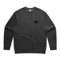 embrace casual cool with an edgy faded look in our iconic UF. faded crew. this faded pullover features a subtle printed "UF.” logo at the front, with an oversized "UF.” graphic boldly displayed across the back.